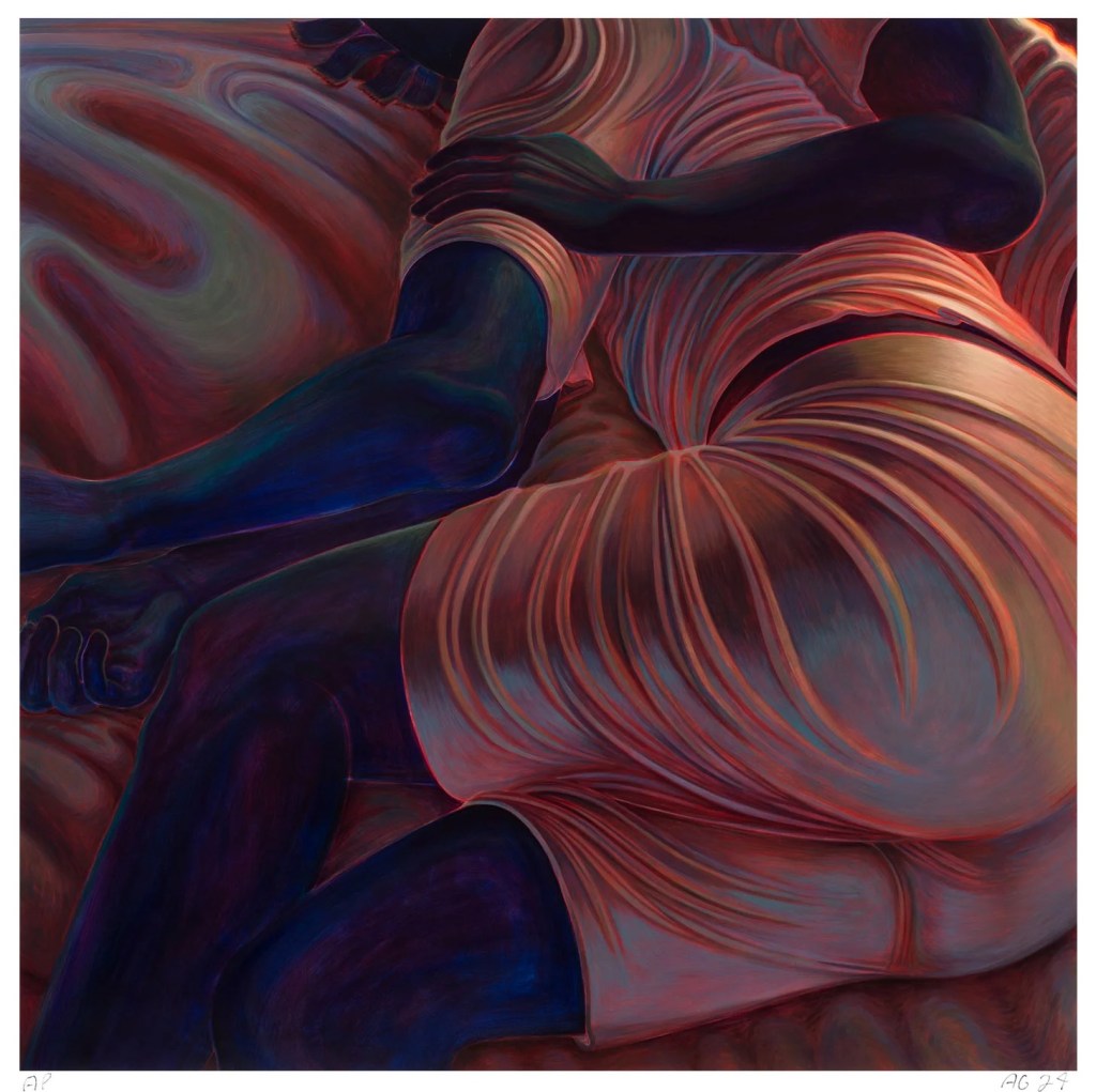 Medium: UV pigment print on 410gsm Somerset Radiant White paper with 4 metallic silkscreen glitter, shimmer layers, a CMYK silkscreen central panel and matte varnish seal